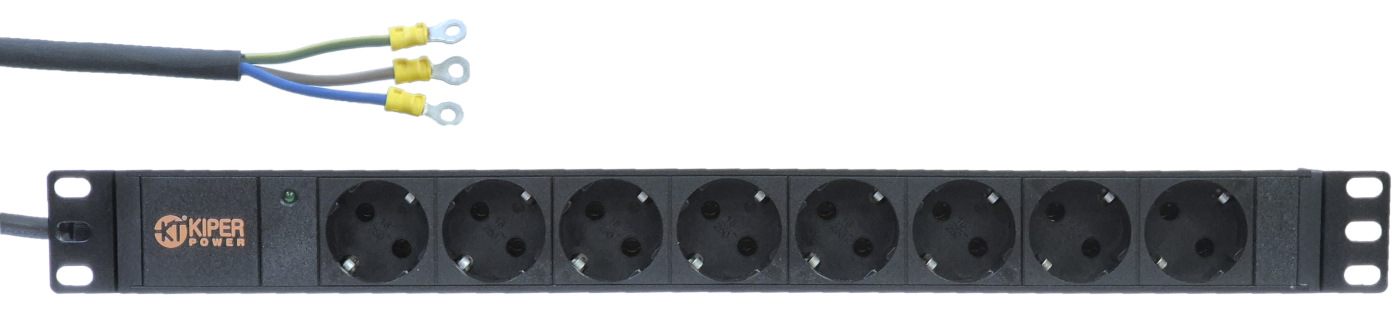 Блок розеток 19", 8 розеток Schuko, 32А, кабель питания 2м без вилки (клеммы под болт)