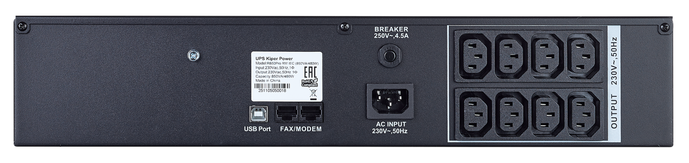Источник бесперебойного питания Kiper Power R1200Pro RM IEC (1200ВА/720Вт.), Розетки IEC C13 - 8шт., управление по USB, защита RJ45, 12В/7,2Ач*2шт.