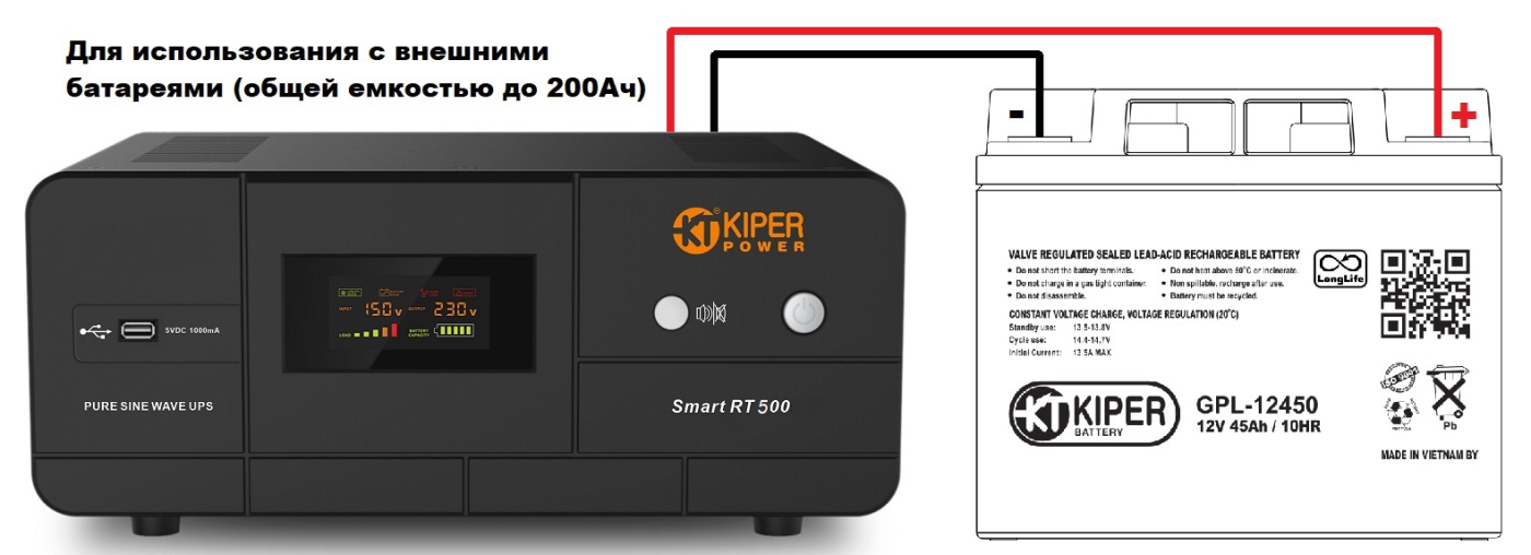 Без АКБ, подключается внешний аккумулятор 12В / от 20Ач до 250Ач для длительного резервирования электропитания.